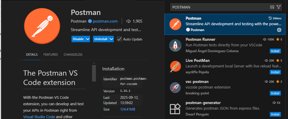 Avame VS Code ja leiame Postman’i ja alla laadime