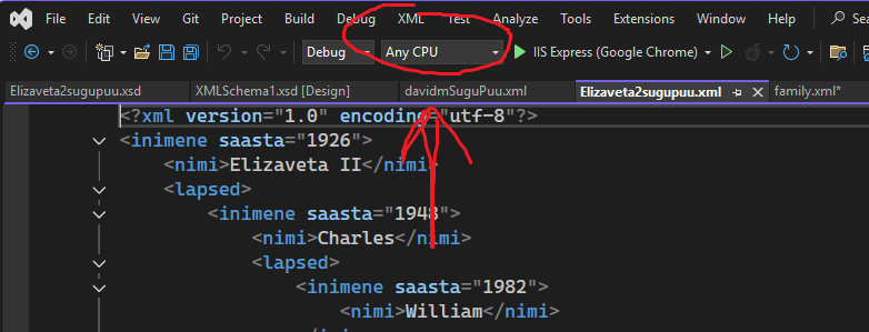 <inimene>– põhiline element.saasta="1961"– atribuut, mis näitab sünniaastat.- Alam-sildid (